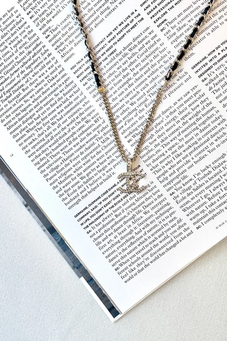現貨//CHANEL 金屬鍊拼皮穿鍊垂墜水鑽雙C 項鍊