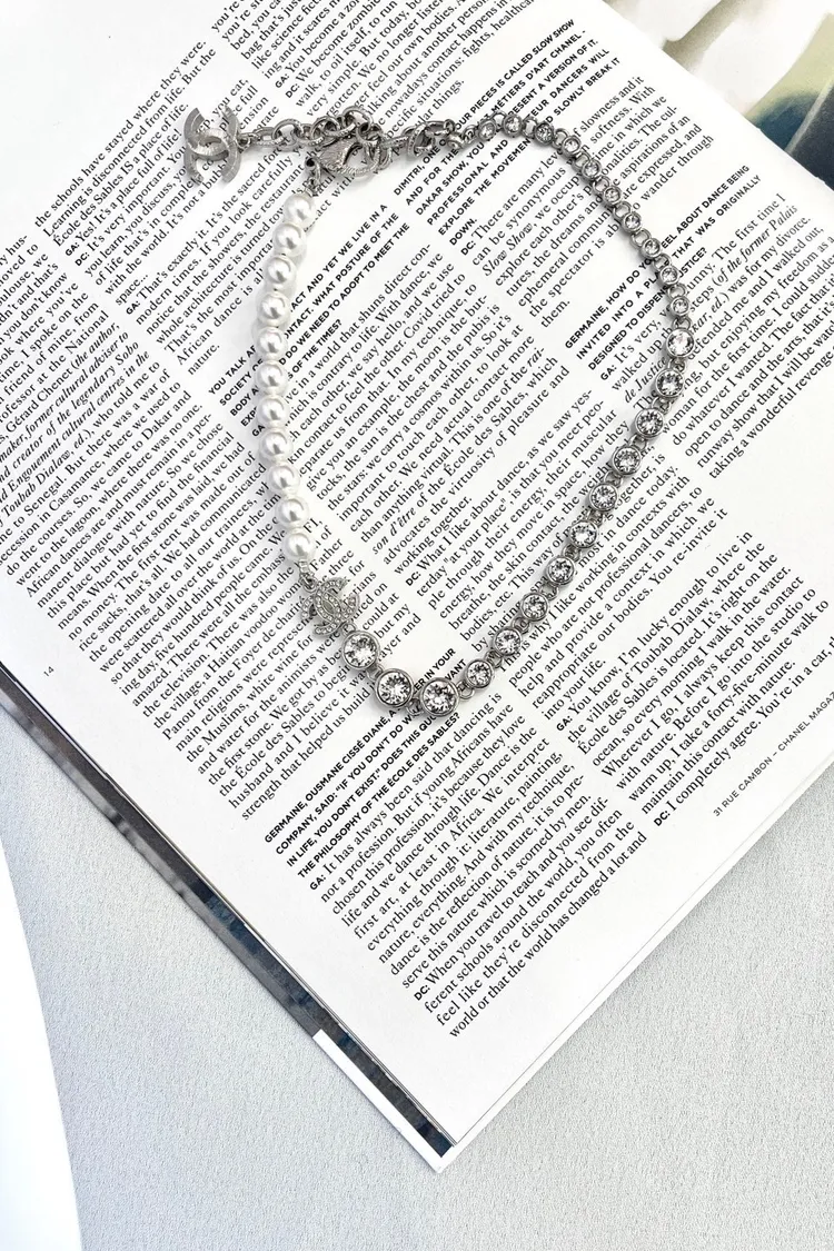 現貨//CHANEL 半珍珠半水鑽鍊 水鑽雙C 銀項鍊