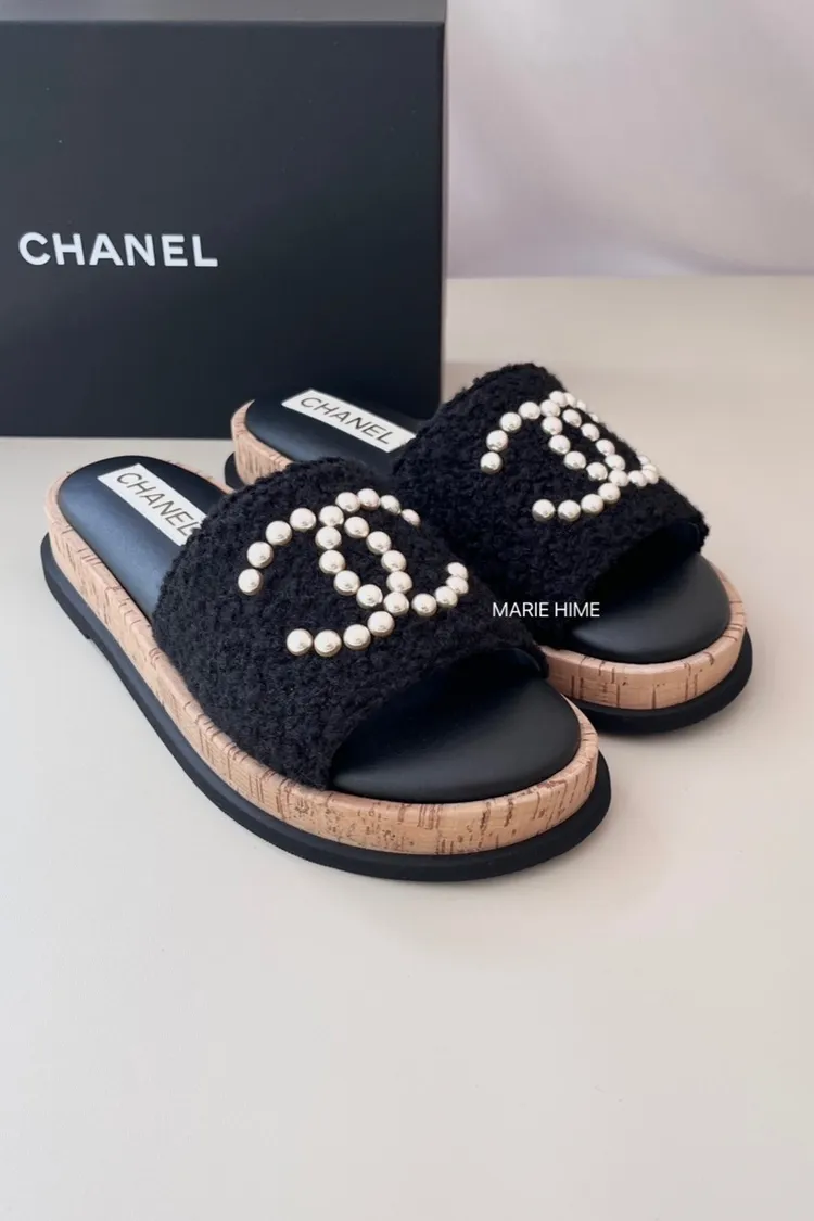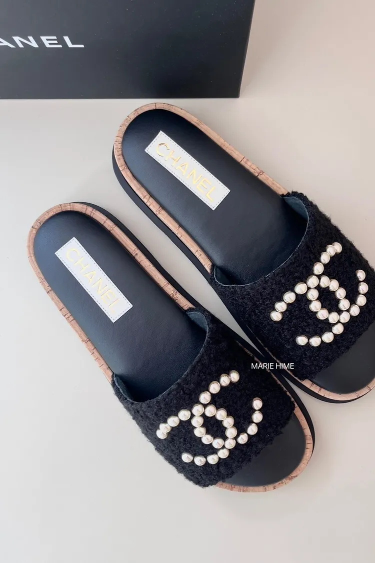 現貨//CHANEL 珍珠雙C毛呢拖鞋