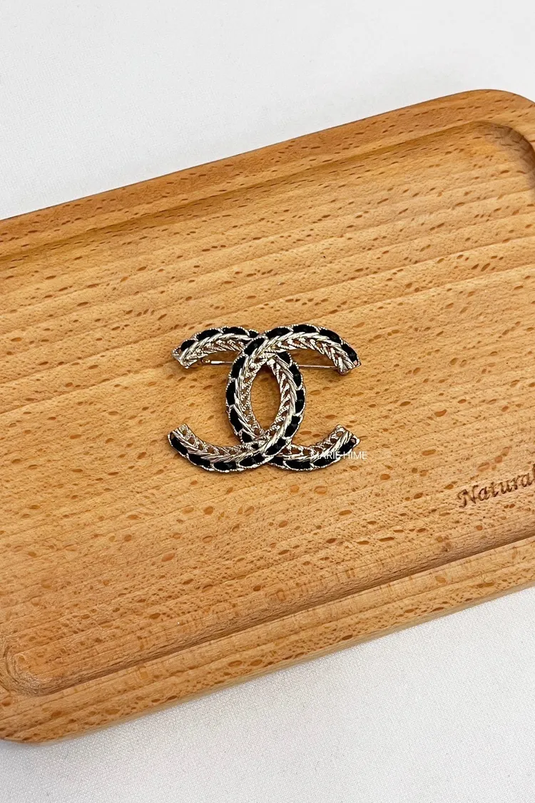現貨//CHANEL 皮穿鍊金屬鍊雙C 胸針