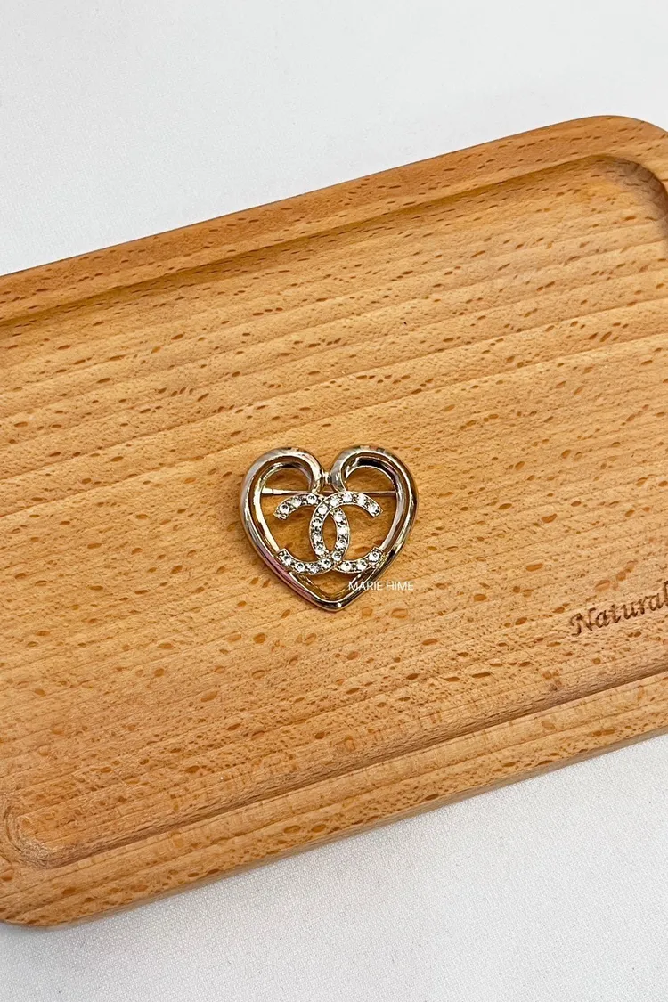 現貨//CHANEL 香檳金鏤空愛心水鑽雙C 胸針