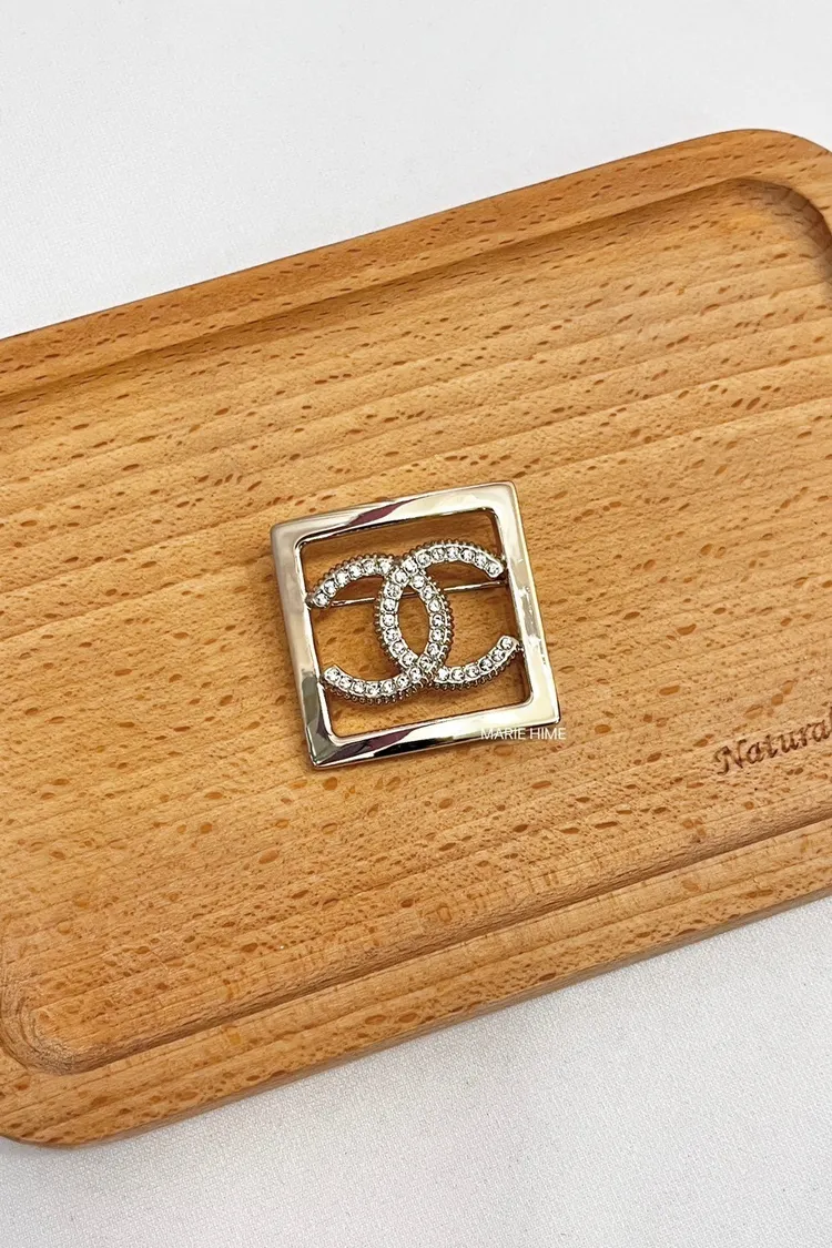 現貨//CHANEL 鏤空方框水鑽雙C 胸針
