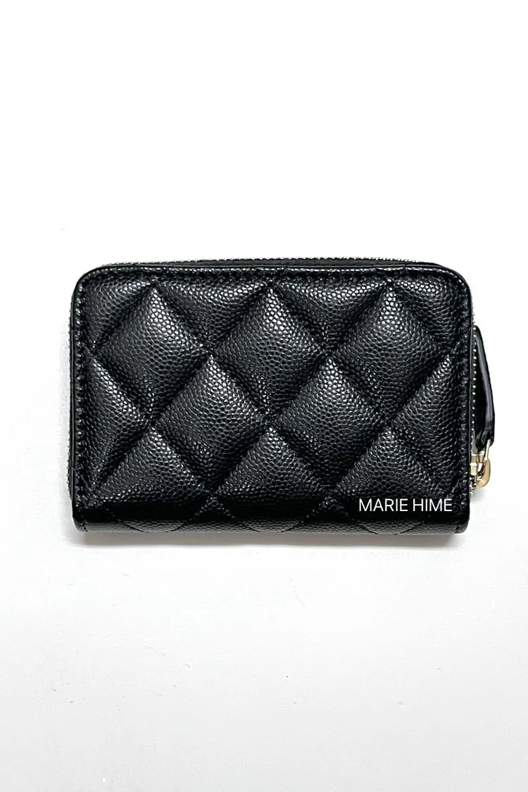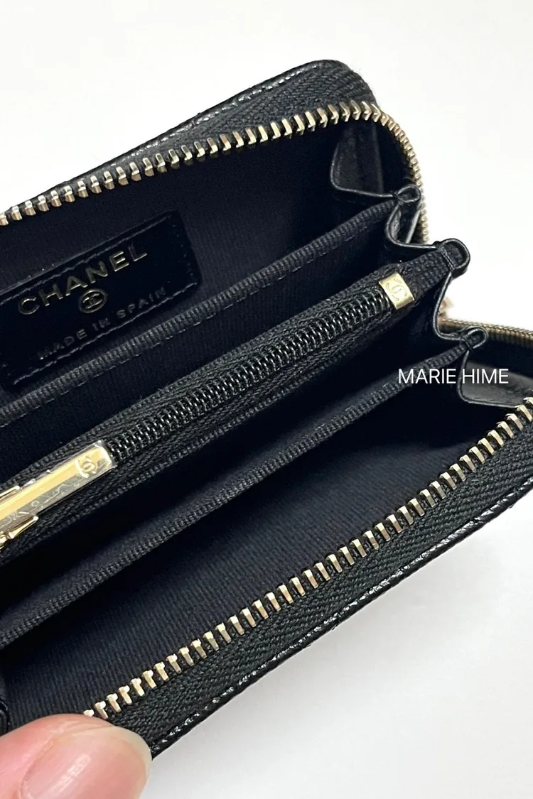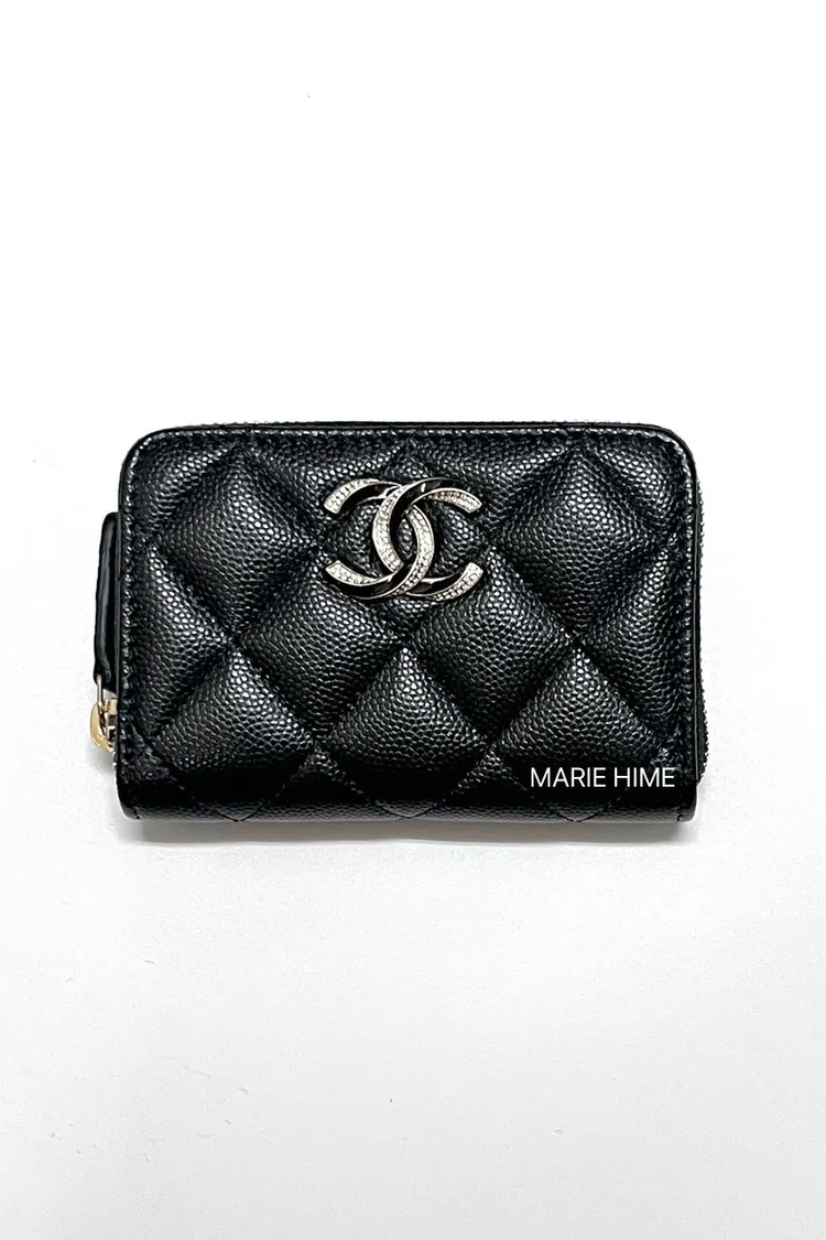 現貨//CHANEL 23S琺瑯水鑽雙C釦拉鍊錢包 荔枝皮黑色金釦