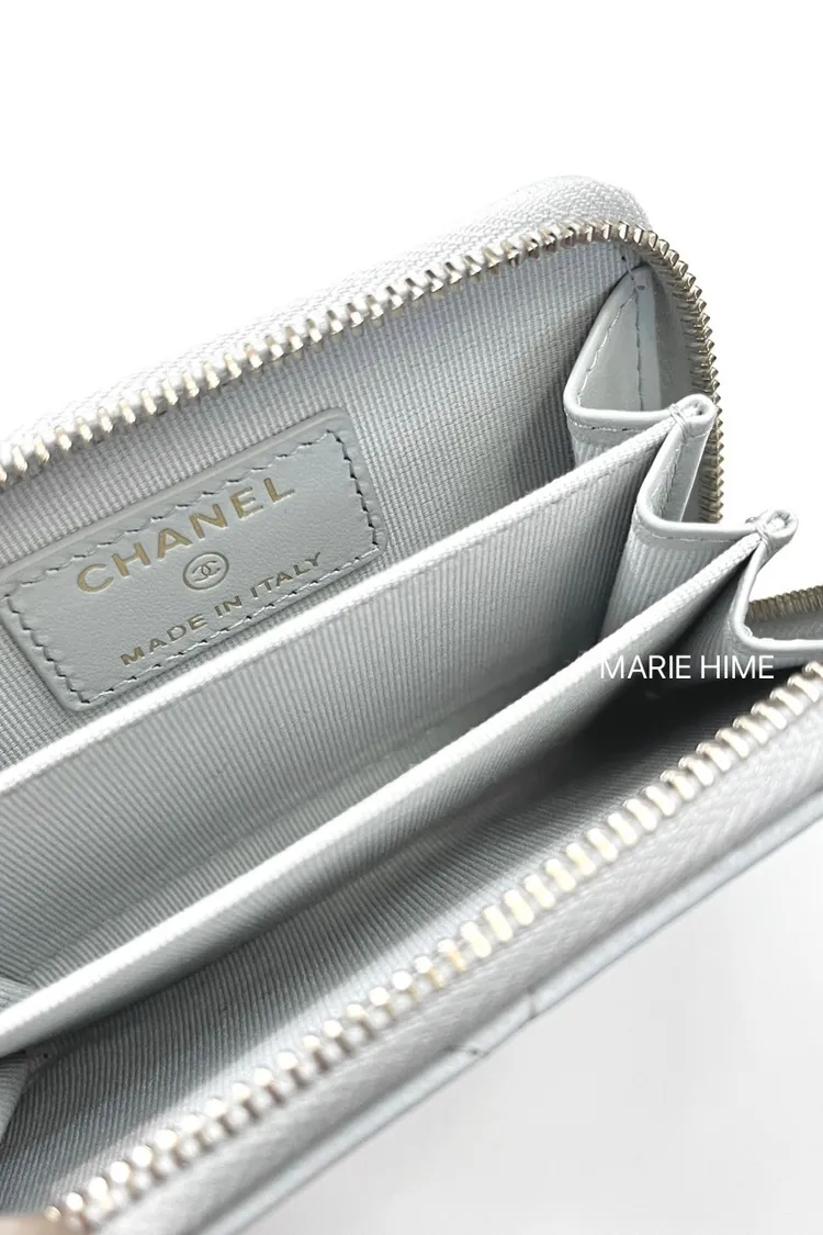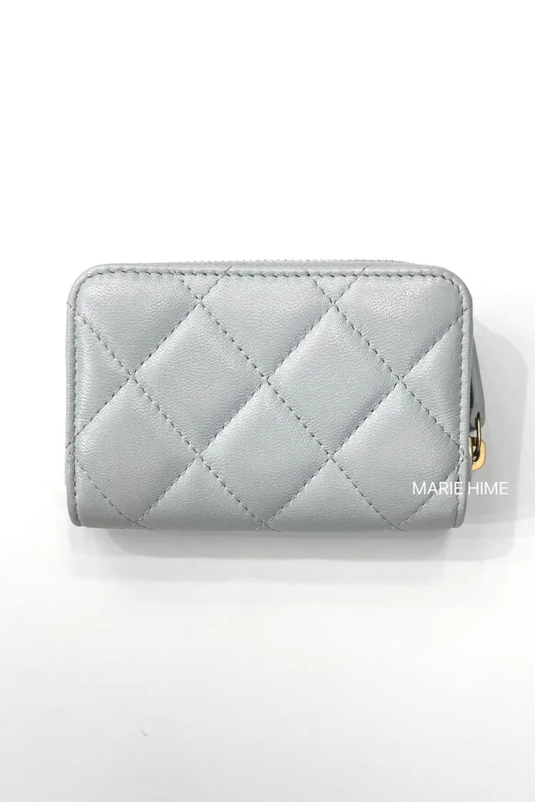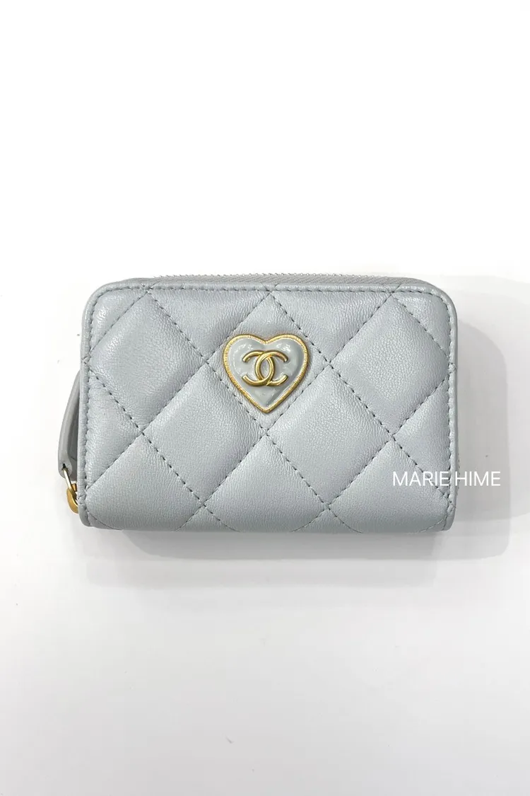 現貨//CHANEL 23S琺瑯愛心釦拉鍊錢包 灰綠色羊皮金釦